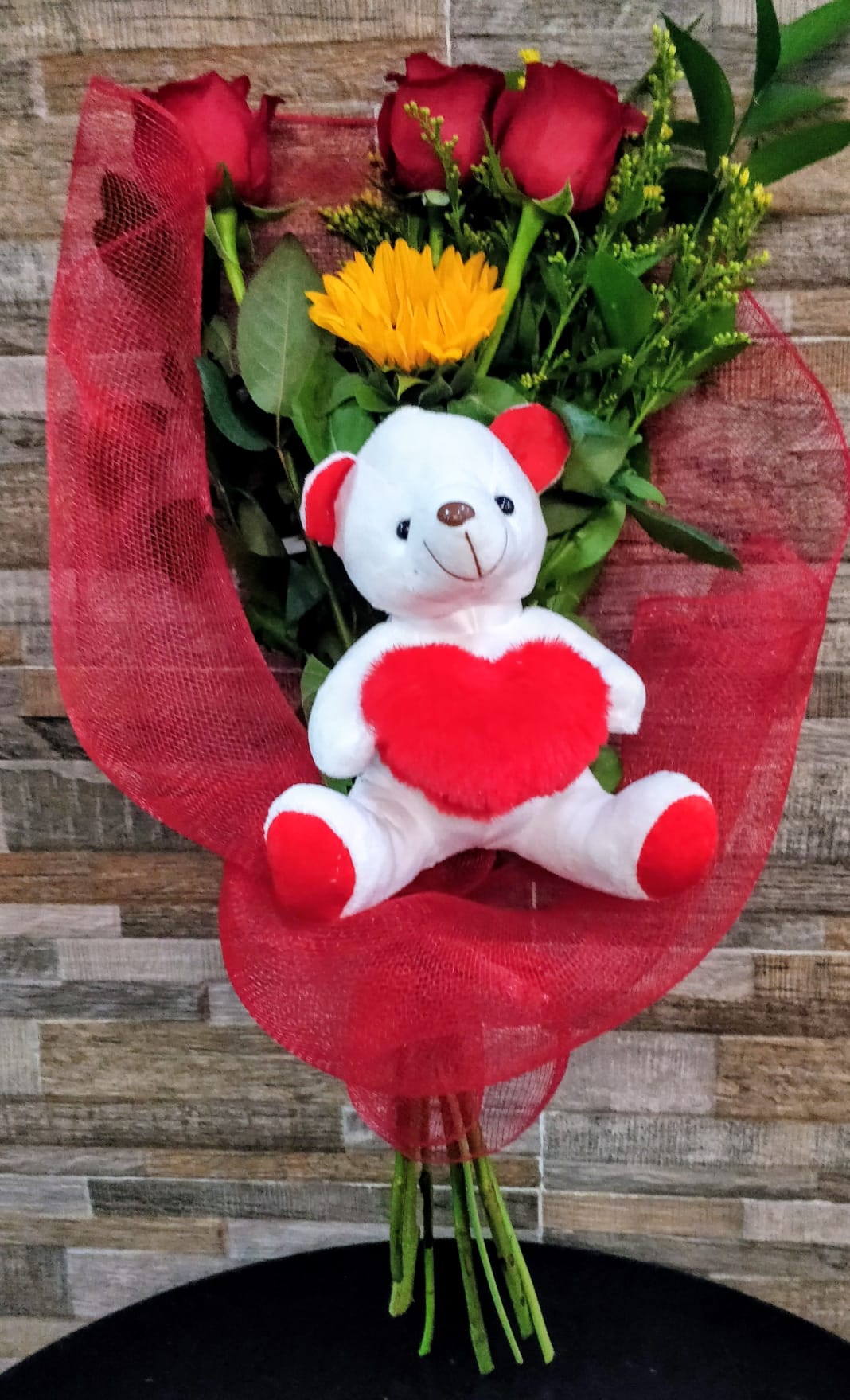 Recensisci per primo “Mazzo 3 rose, girasole e orso peluche”